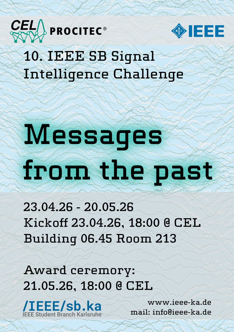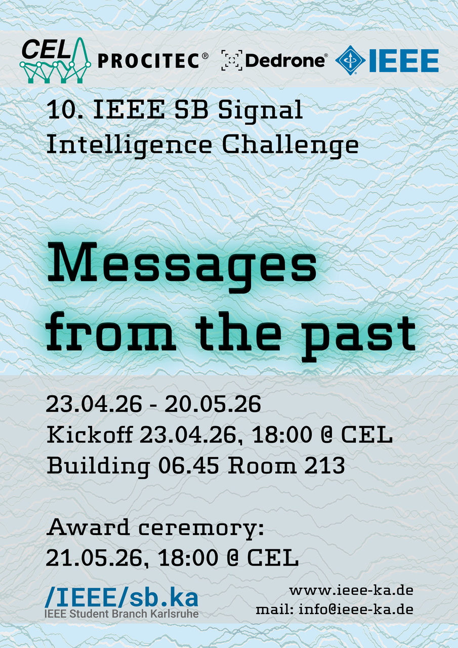 In 2025, there was no signal intelligence challenge hosted by the IEEE student branch. We decided to hold another edition of the signal intelligence challenge in 2026. This time it should start on April 15th, 2026, and should run through May 6th, 2026. This should provide us with some better opportunities with good weather. Oliver Fritz from the Communications Engineering Lab (CEL) will help out with running the challenge and organizing the events.